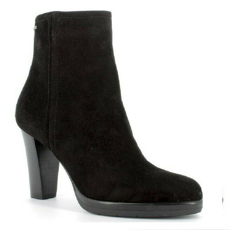 Tronchetti Donna nero realizzato con tomaia in camoscio, suola ini gomma nero con tacco di 9 cm. Chiusura con zip laterale, con punta arrotondata.