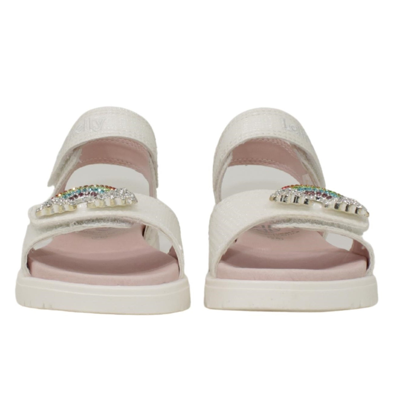 Sandali Brite Bambina, color bianco in glitter. Dettaglio rifiniture in glitter tinta su tinta, applicazione arcobaleno con brillantini multicolore in contrasto. Fondo in gomma antiscivolo con chiusura anteriore con strappo. Calzata regolare