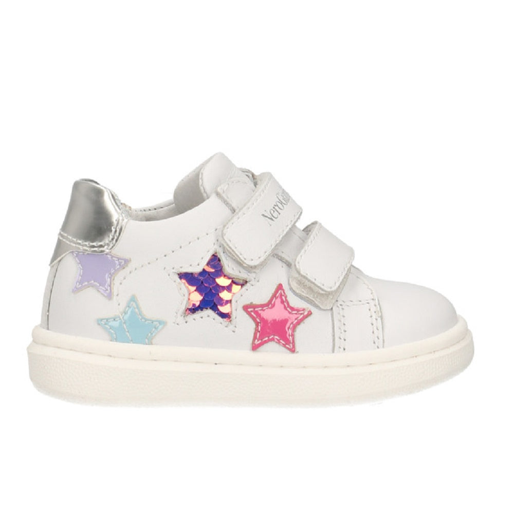 Sneakers primi passi da bimba realizzate in Italia con materiali di qualità e testati in laboratorio. Continua ricerca stilistica per trend nuovi e originali. Il sottopiede con tecnologia DryGo!® assorbe l'umidità e garantisce confort e benessere. Modello in pelle con applicazioni a forma di stella e paillettes. Comoda chiusura in velcro e fondo box ultraleggero.