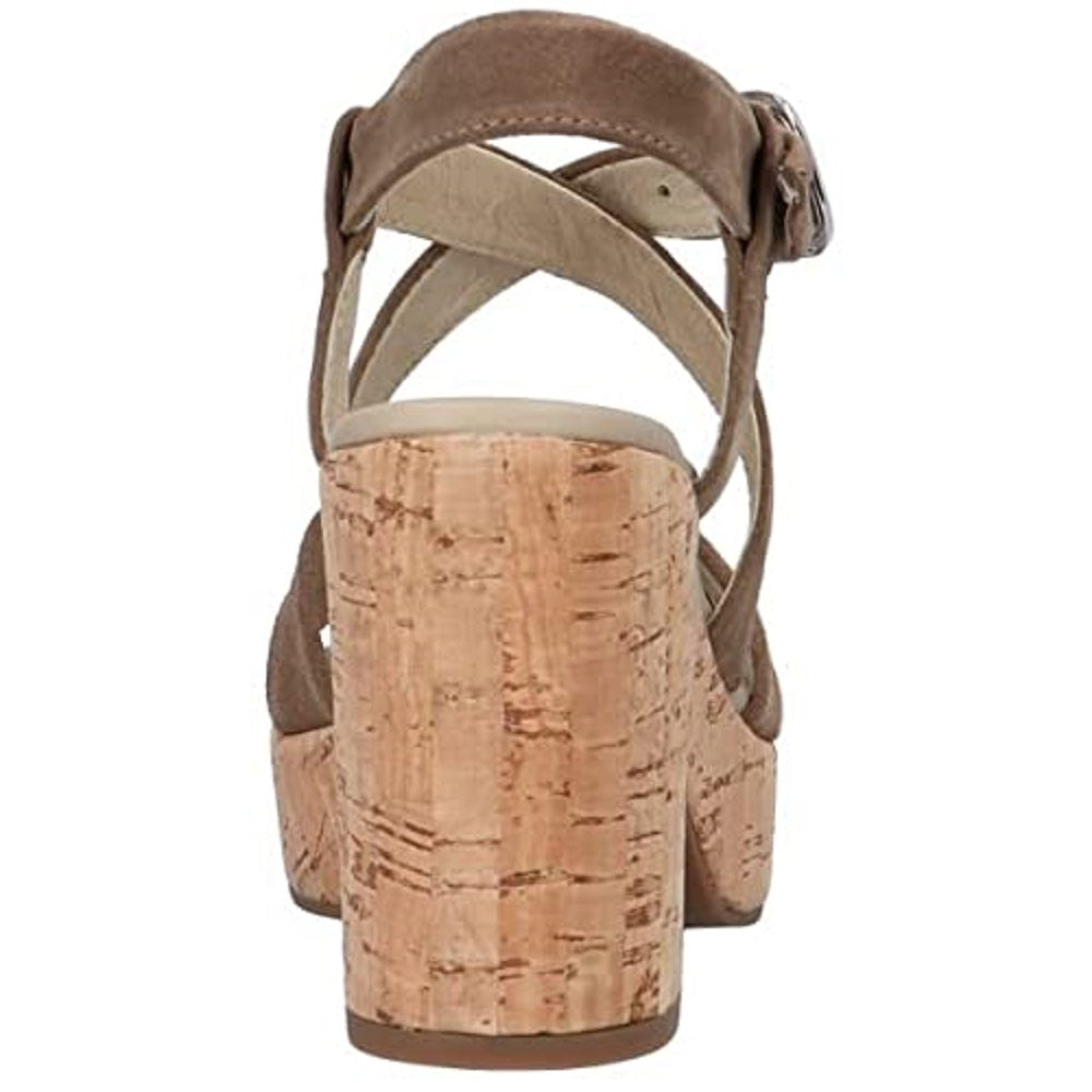 Sandali in camoscio con listini incrociati e cinturino alla caviglia. Tacco di 9 cm e plateau di 3 cm ricoperti in sughero.
