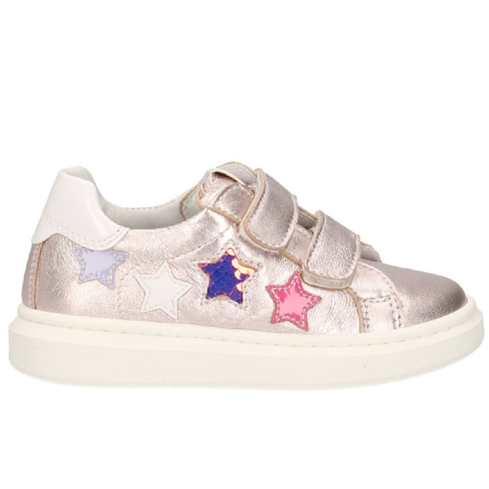 Sneakers primi passi da bimba realizzate in Italia con materiali di qualità e testati in laboratorio. Continua ricerca stilistica per trend nuovi e originali. Il sottopiede con tecnologia DryGo!® assorbe l'umidità e garantisce confort e benessere. Modello in pelle laminata con applicazioni a forma di stella e paillettes. Comoda chiusura in velcro e fondo box ultraleggero.
