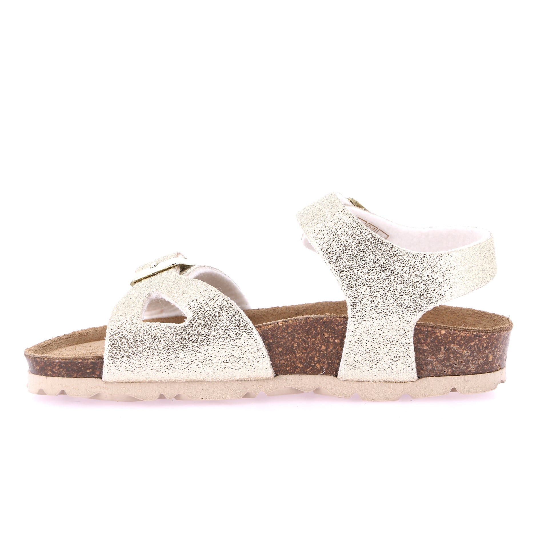 Una tomaia luminosa dall'effetto brillantinato per un sandaletto unico nel suo genere. Il plantare in sughero naturale ed il sottopiede in vera pelle rendono questo modello comodo e perfetto per tutte le bimbe.