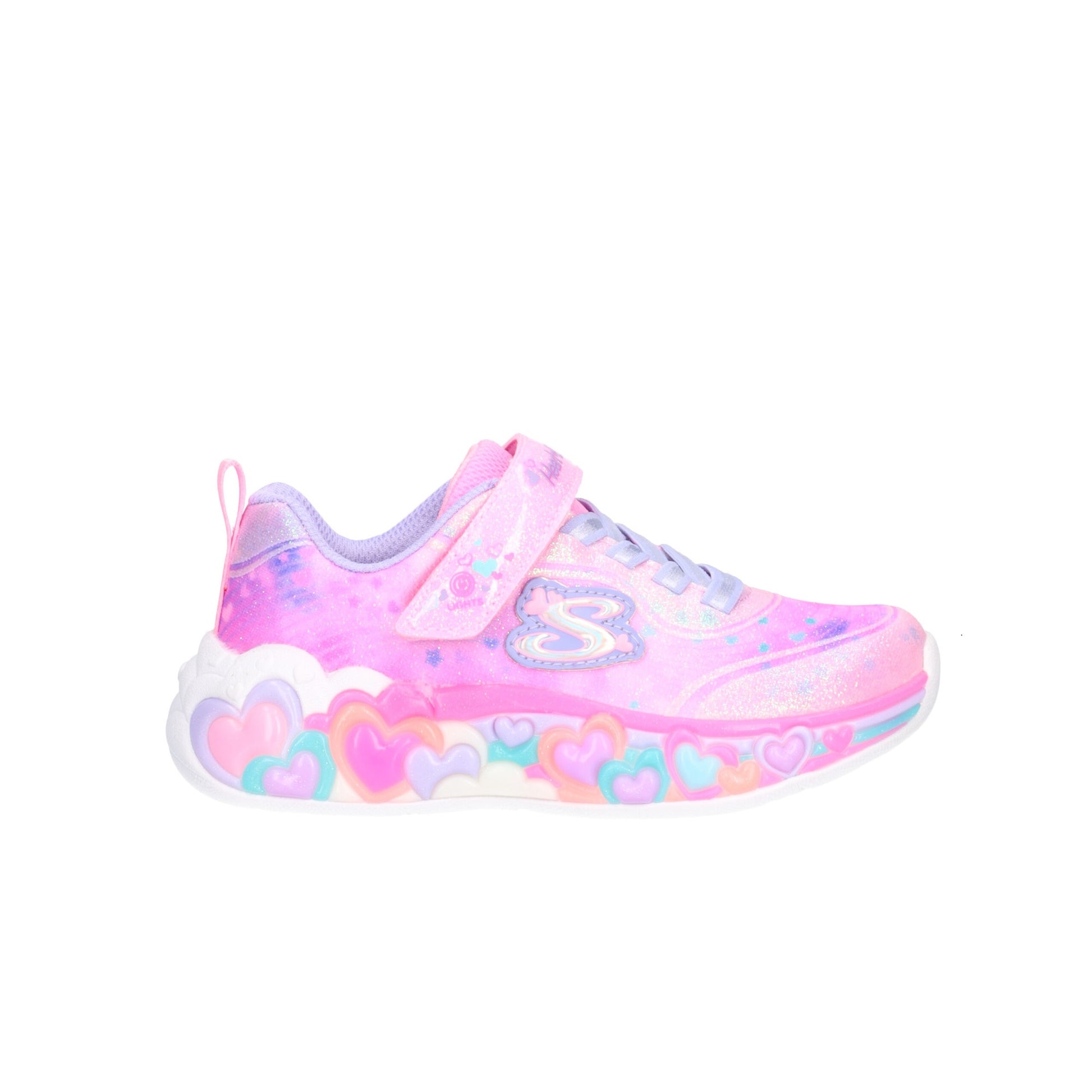 Sneaker Skechers bambina in tessuto rosa con dettaglio in vernice e finto laccio elastico fodera e sottopiede in tessuto, fondo iin gomma con luci che illuminano ogni passo.