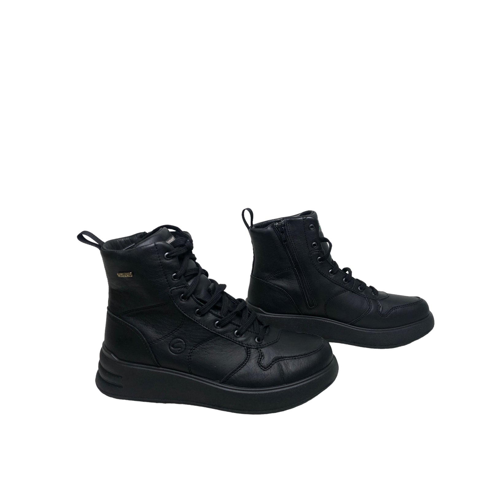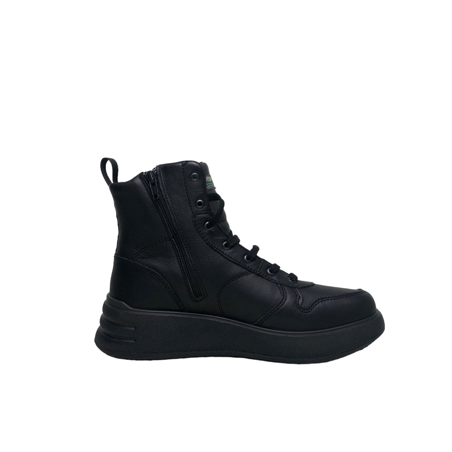 Scarponcini per Donna Grisport Active realizzate in pelle nera con allaccio tramite lacci con 7 passanti e chiusura a lampo lato interno.