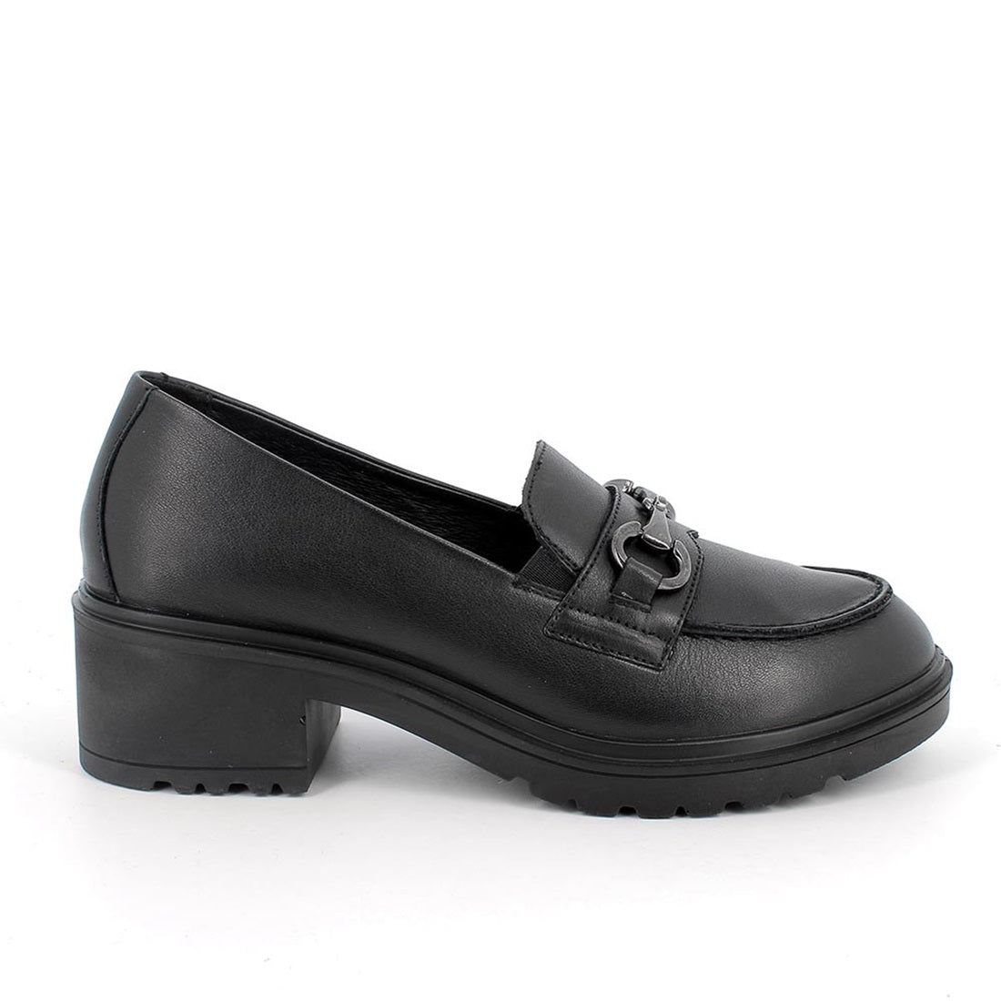 Mocassino in pelle, con tacco. Elastici per facilitare la calzata. Vaschetta e morsetto ornamentale Adatto ad ogni occasione, con gonna o pantaloni. Prodotto nuovo