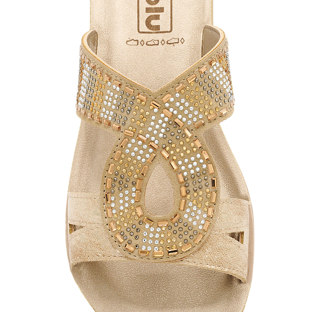 Tutta la praticità della doppia fascia si unisce alla comodità del plantare in ecopelle imbottito. La suola è leggera e flessibile, mentre i brillantini bicolore rendono queste ciabatte glam.