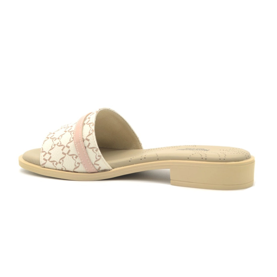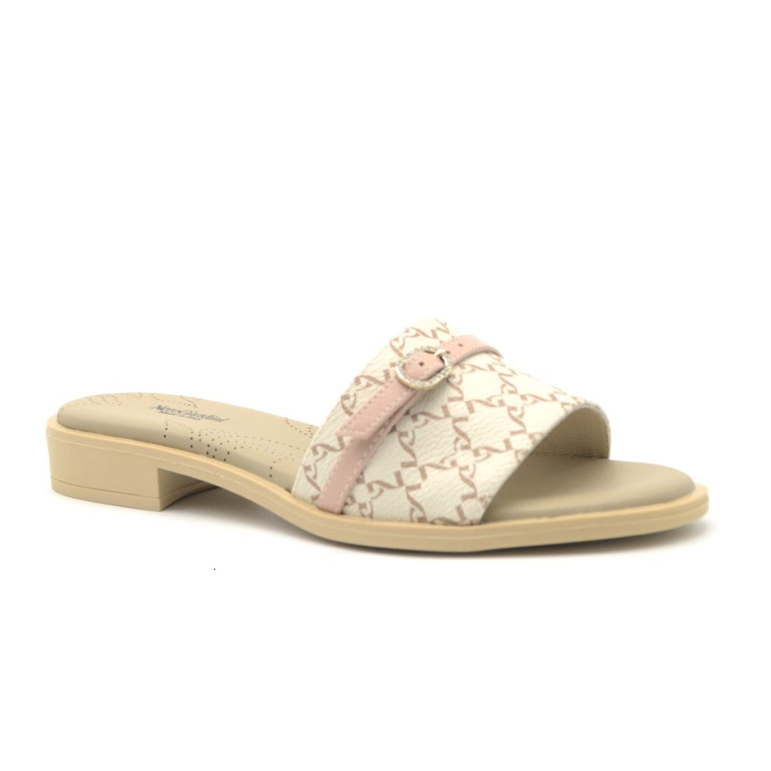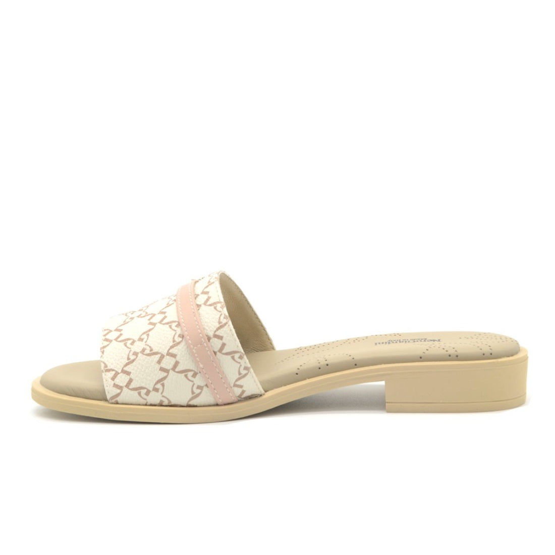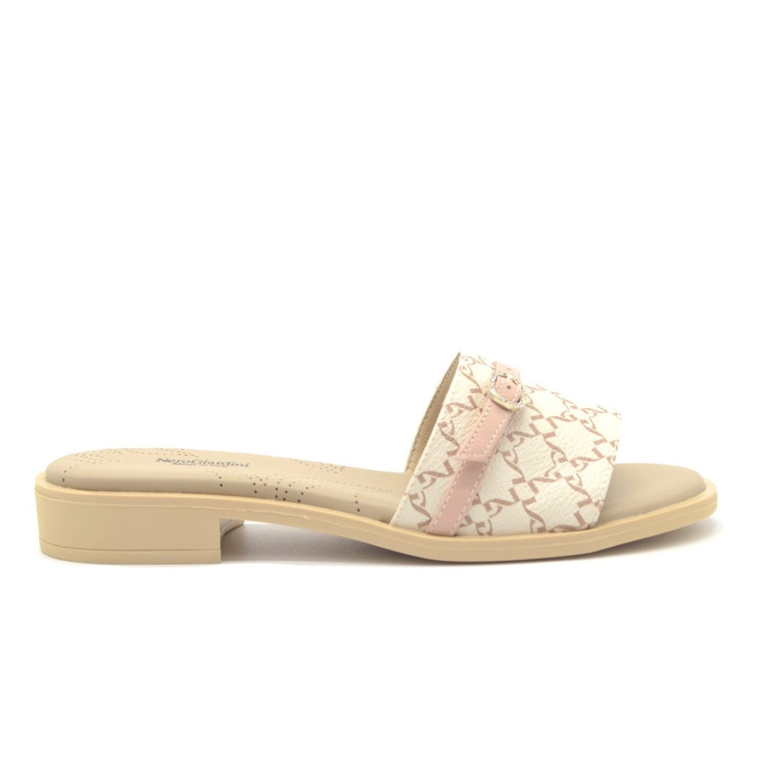 Nero Giardini sandalo a ciabatta Made in Italy donna in pelle con fascia in stampa monogram, fibbietta di strass decorativa, fodera e sottopiede in pelle, fondo leggero in gomma con tacco basso.