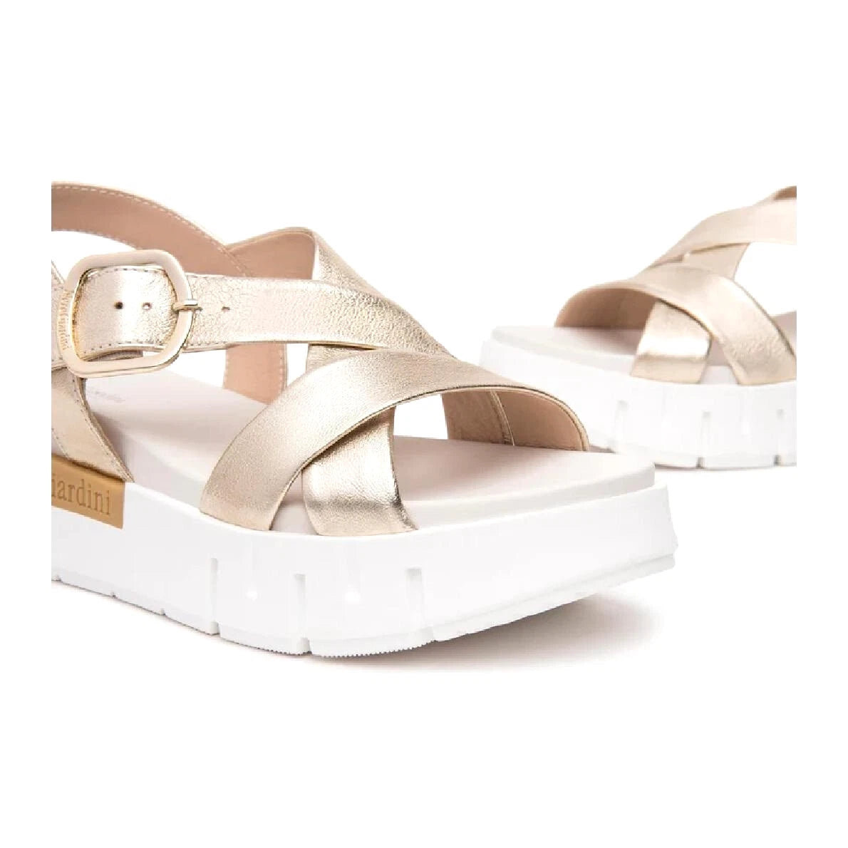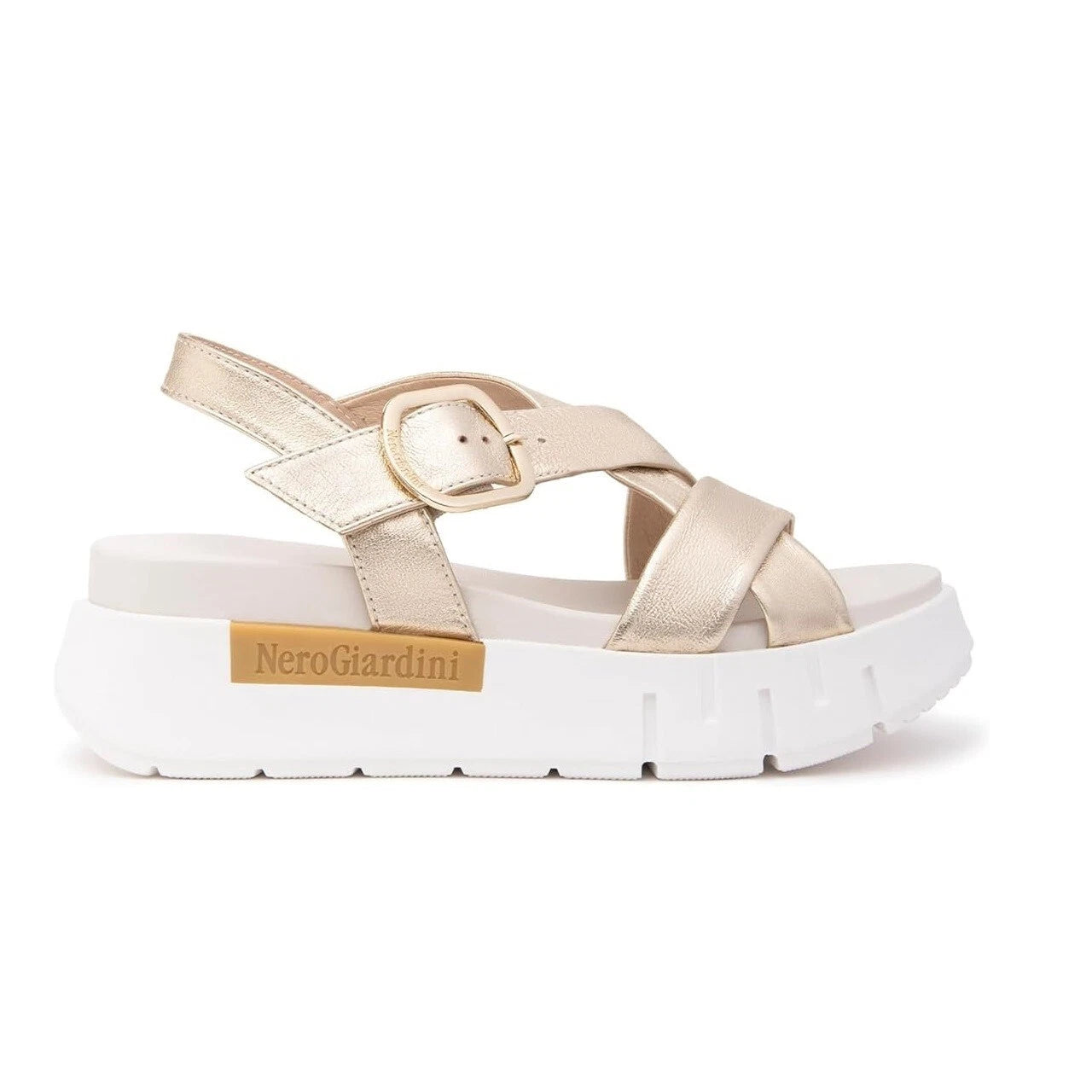 Sandali platino da donna in vera pelle laminata dotati di fibbia di chiusura laterale e zeppa in gomma alta circa 5 cm.