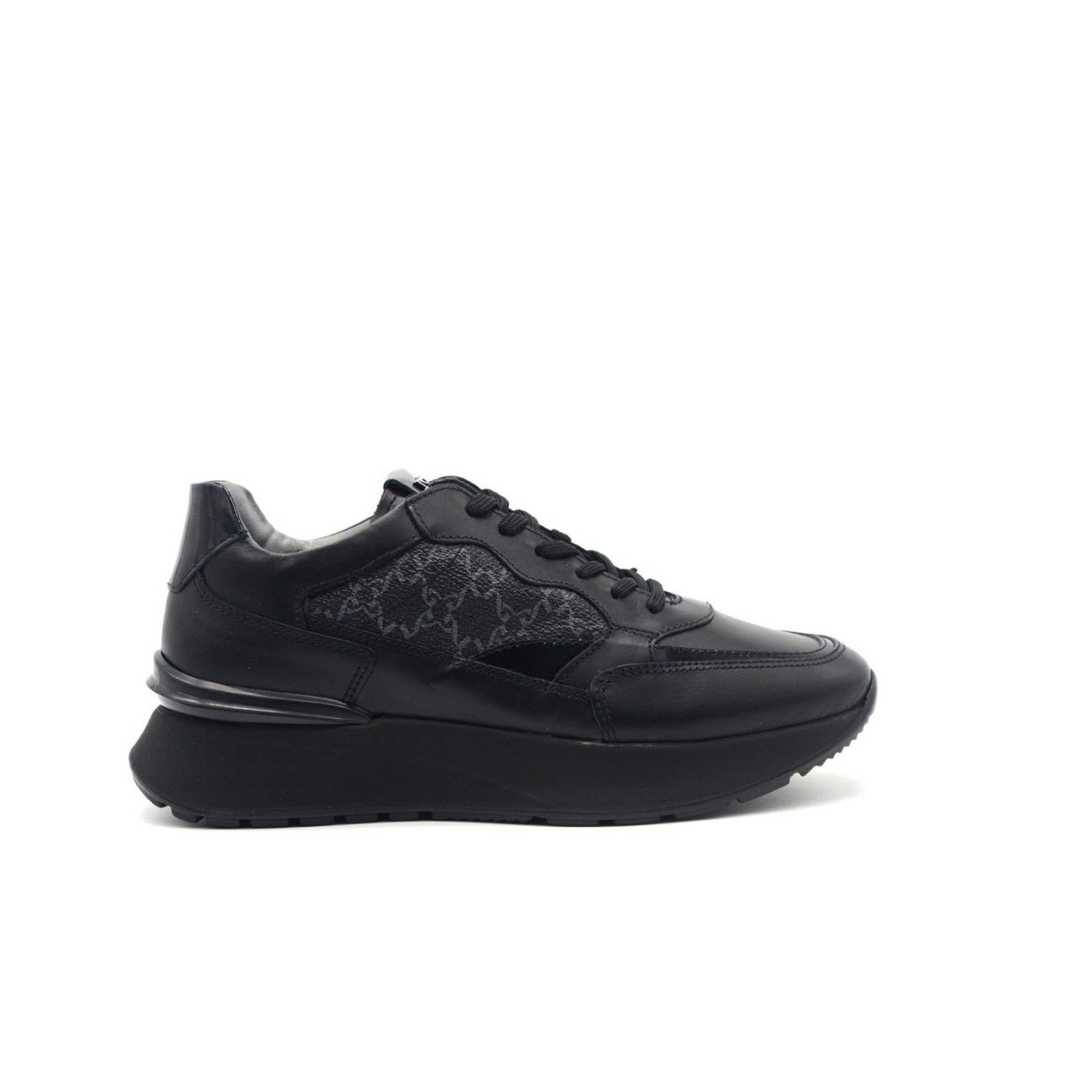 Nero Giardini sneakers stringata Made in Italy donna in pelle con inserti in vernice e pelle stampa monogram, fodera e sottopiede estraibile in pelle, fondo in gomma con rialzo interno.