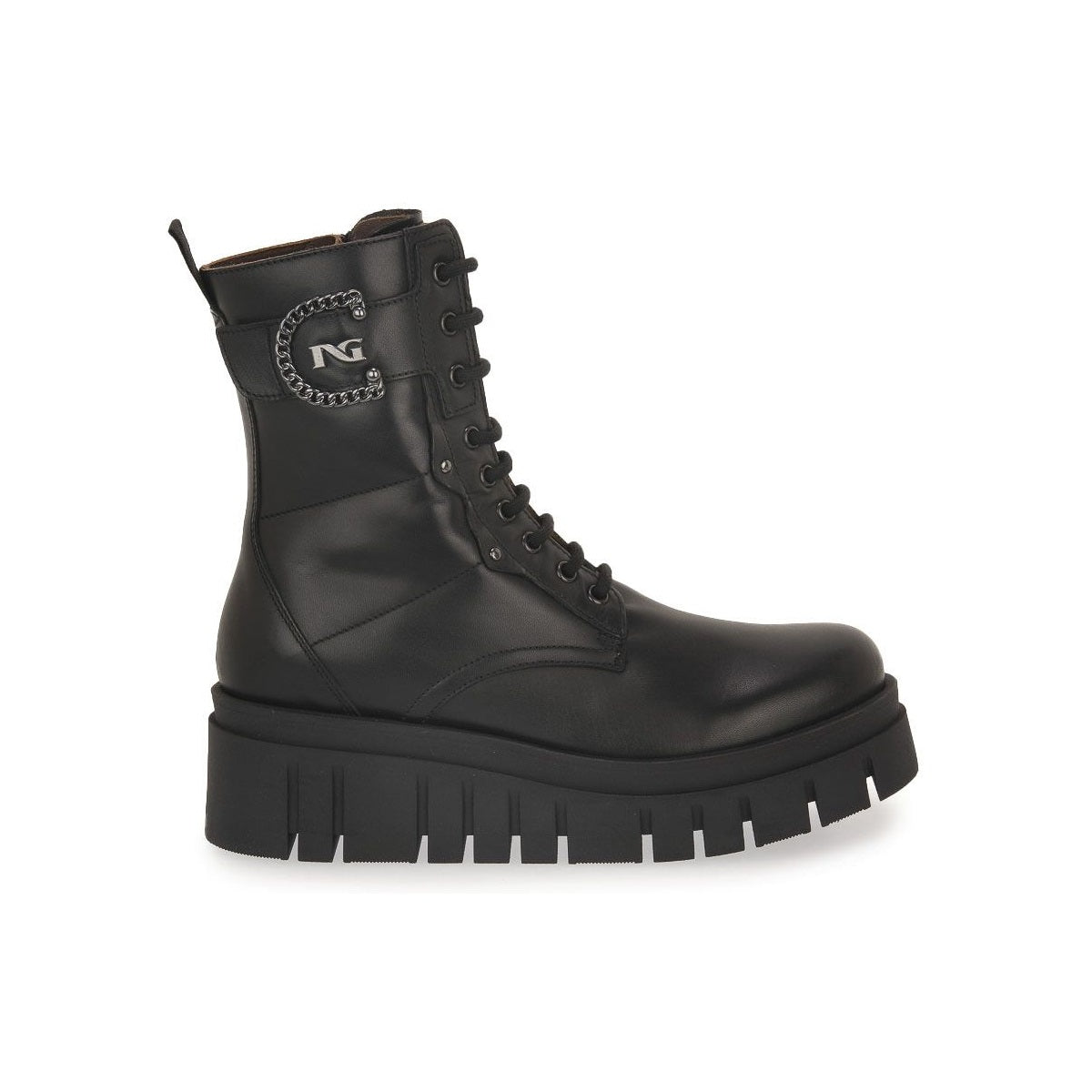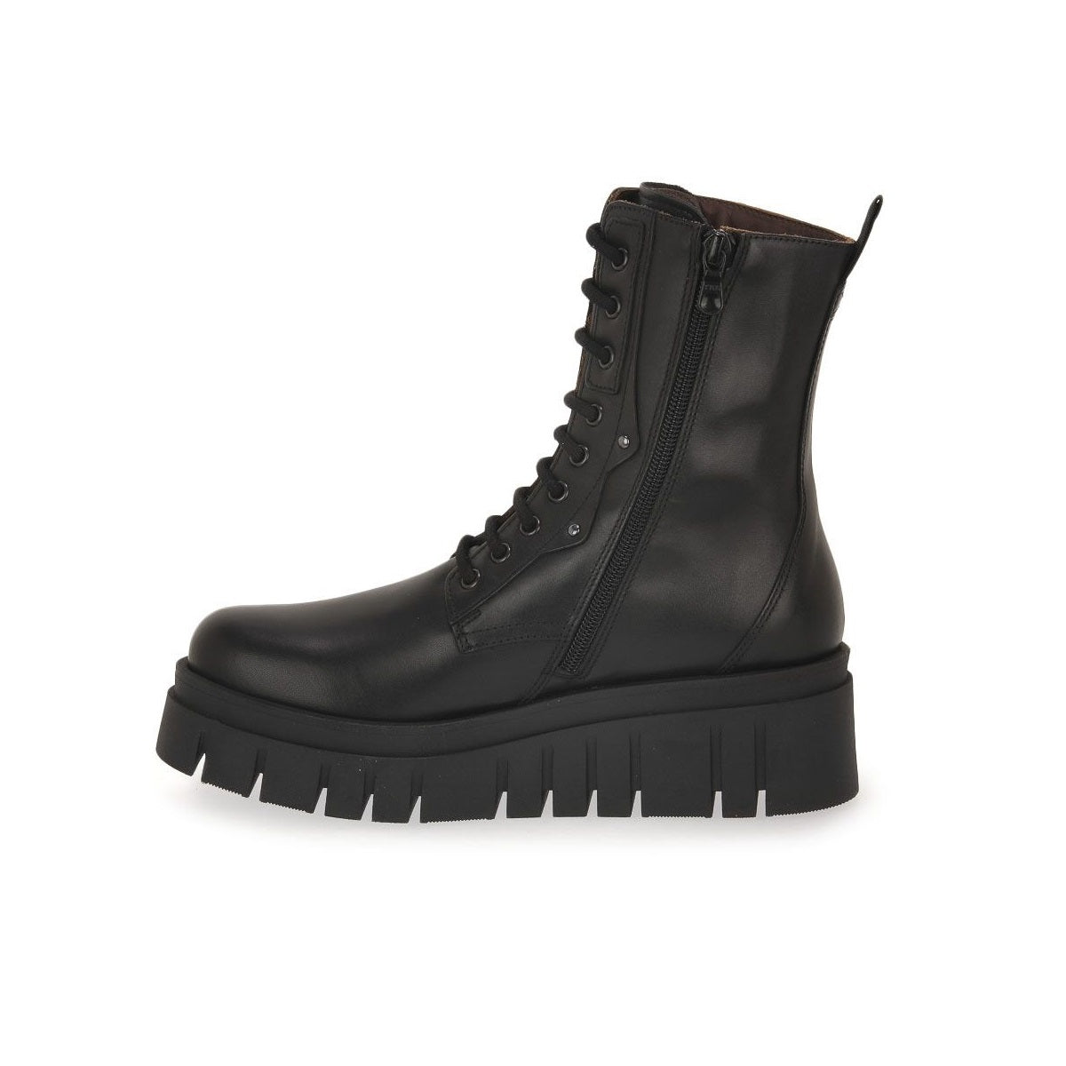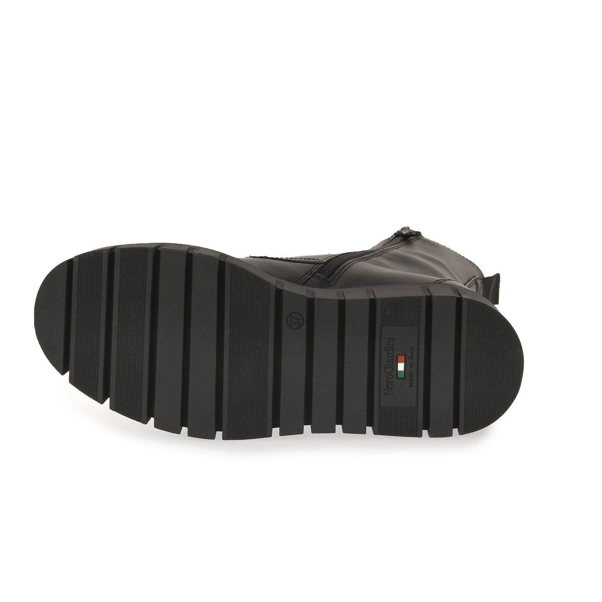 Anfibi Nero Giardini Made in Italy realizzati in pelle con suola in gomma. La zip laterale facilita la calzata. Linea grintosa per un look di tendenza.