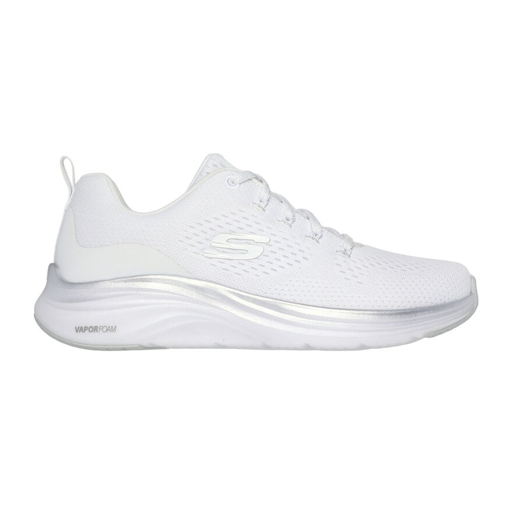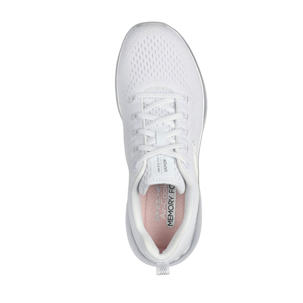 Scegli il comfort leggero e lo stile elegante indossando Skechers Vapor Foam™ - Midnight Glimmer. Questo modello vegan con lacci presenta una tomaia in mesh ingegnerizzato con soletta Skechers Air-Cooled Memory Foam®, finiture metallizzate e ammortizzazione Vapor Foam™ ultraleggera