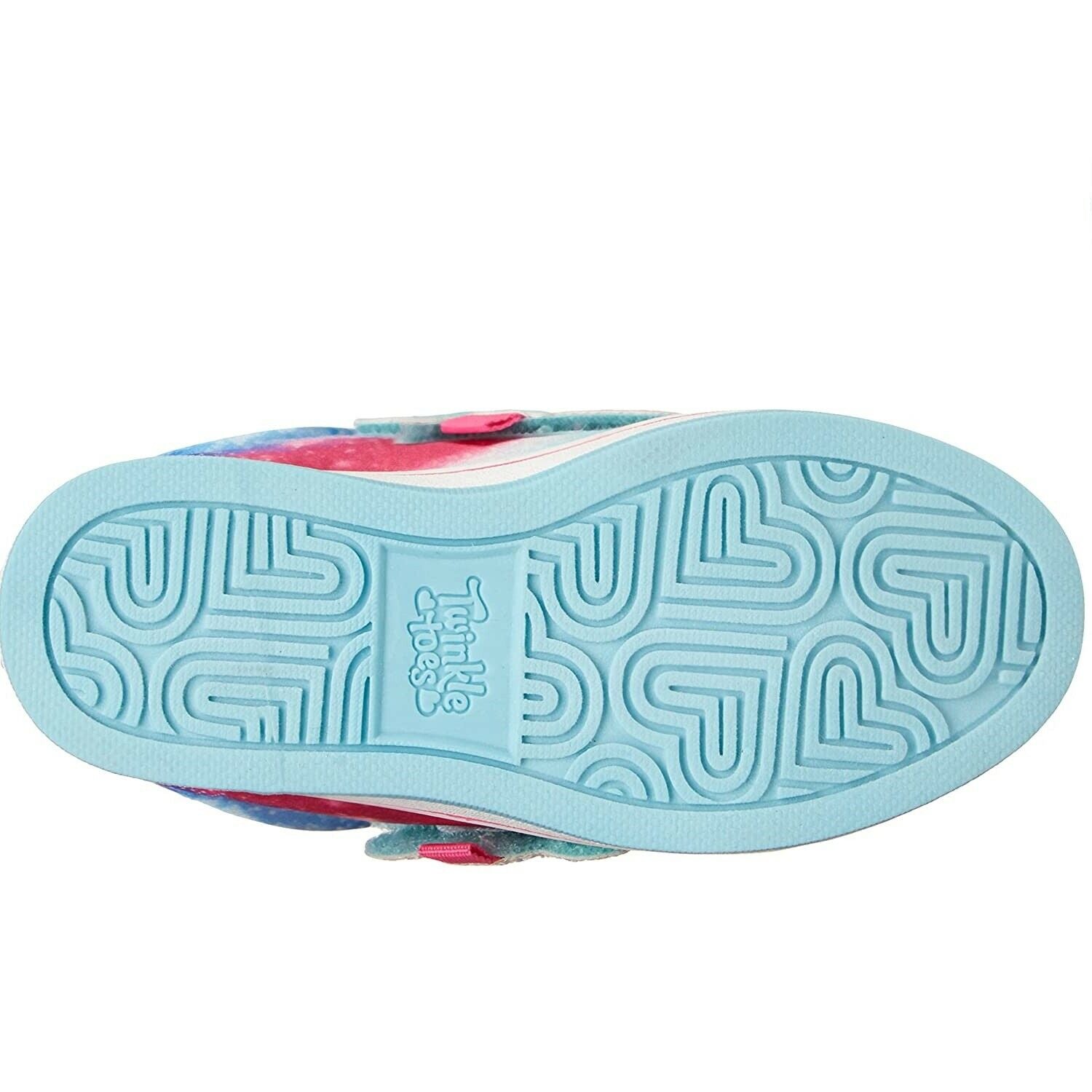 Il design sportivo e luminoso presenta una tomaia in tessuto sfumato glitterato con cinturino a strappo a forma di nuvola. Punta ad aletta impreziosita da strass. Soletta comfort vulcanizzata con banda colorata e suola flessibile in gomma.